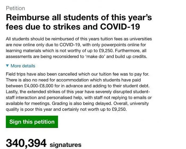 由于疫情迫使很多英國學校關閉,學生無法使用圖書館等設施,課程也都改成網(wǎng)課,留學生認為自己支付的高昂學費“打水漂”了,因此在英國議會網(wǎng)站發(fā)起聯(lián)名請愿,要求英國大學退還2019/2020學年的整年學費和住宿費,目前已有超過34萬名學生加入了該請愿。