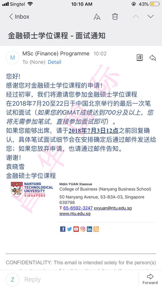 畢業(yè)于中國海洋大學的Z同學,GPA:3.71,在青島某機構申請新加坡南洋理工大學碩士,臨近開學缺遲遲未通過。經(jīng)朋友介紹來到了昌華國際,我們的老師綜合分析學生的實際情況,在時間緊任務重的情況下立即開展資料的制作與背景提升。成功申請到新加坡南洋理工大學的兩個碩士項目。